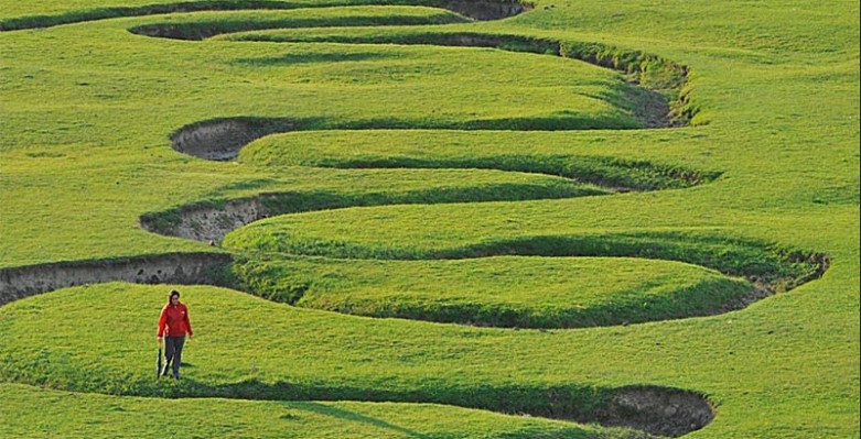 Yemyeşil bir alanda göl ve menderes manzaralı tabiat yürüyüşü.